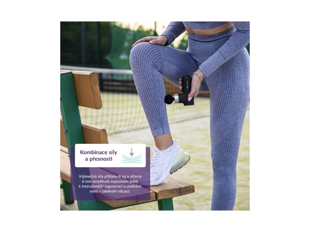 Telo masážnej pištole je síce malé, ľahké a dobre padne do ruky, ale ukrýva v sebe prítlačnú silu až 8 kg. Pracuje však veľmi ticho aj pri frekvencii až 2850 vibrácií za minútu, takže počas masáže nikoho nerušíte. Amplitúda je 6 mm a môžete si vybrať zo 4 intenzít masáže. Časté nabíjanie vás taktiež nemusí trápiť, pretože lítiová batéria vydrží až 3 hodiny používania.
