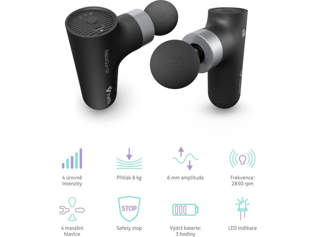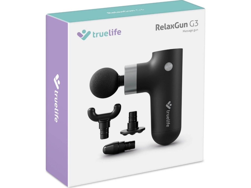 Či už športujete a potrebujete uvoľniť svoje vyťažené svaly, alebo máte sedavé zamestnanie a chcete pomôcť zmierniť napätie a bolesť, masážna pištoľ TrueLife RelaxGun G3 je pre vás to pravé. Z pohodlia domova vás vymasíruje, pomôže zregenerovať svaly, zlepší prietok krvi a uvoľní kŕče. Jednoducho si vyberte jednu zo 4 vymeniteľných hlavíc a zvoľte jednu zo 4 intenzít masáže. Malé, ľahké telo, ktoré dobre padne do ruky, má prítlak 8 kg a frekvenciu pohybu až 2850 pohybov za minútu. Amplitúda je 6 mm. Bezpečné používanie zabezpečuje funkcia Safety stop, ktorá spomalí alebo vypne stroj, ak je vyvíjaný príliš veľký tlak. Po 15 minútach používania sa automaticky vypne. Nabíjateľná lítiová batéria zvládne až 3 hodiny prevádzky.