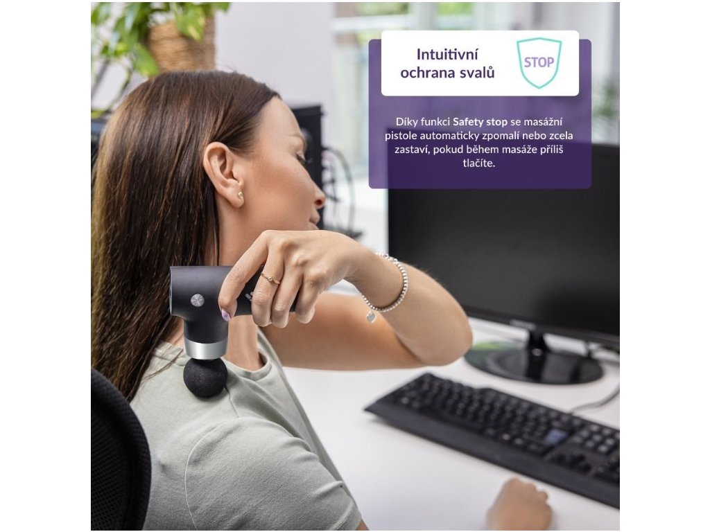 Aby sa predišlo zraneniu, masážna pištoľ je vybavená funkciou Safety Stop, ktorá automaticky spomalí alebo zastaví motor, ak počas masáže vyvíjate príliš veľký tlak. Zariadenie sa po 15 minútach masáže samo vypne. Ovládanie je veľmi intuitívne a jednoduché, pretože na jeho použitie stačí jedno tlačidlo.