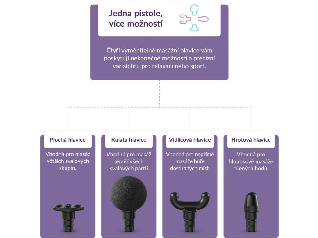 Masážna pištoľ je vybavená štyrmi masážnymi hlavicami na rôzne typy masáží.