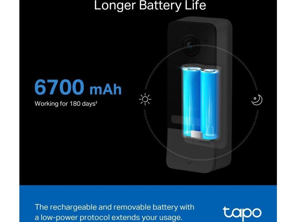 - Živé zobrazenie 2K 5Mpx: Vďaka aplikácii Tapo budete vždy vedieť, čo sa deje pred vašimi dverami. S snímačom Starlight a rozlíšením 2K