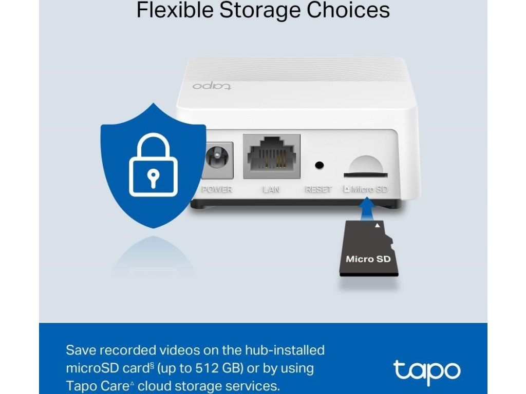 - Flexibilná voľba úložiska: Nahrané videá môžete ukladať na microSD kartu§ (až do 512 GB) vloženú v centrále alebo do cloudového úložiska v rámci služby Tapo Care.?