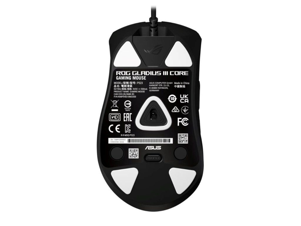 ROG Gladius III Core je 72gramová káblová herná myš s ergonomickým tvarom, vybavená optickým senzorom s rozlíšením 12 000 dpi, spínačom ROG Micro Switch II, zásuvkami ROG Push-Fit Switch Sockets, káblom ROG Paracord a 100% PTFE podložkami.