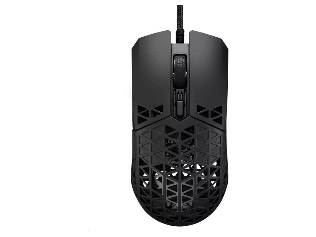 Ľahká drôtová herná myš so snímačom s rozlíšením 16 000 dpi, šiestimi programovateľnými tlačidlami, ultraľahkým plášťom Air Shell, odolnosťou voči vode IPX6, antibakteriálnou ochranou ASUS, šnúrkou TUF Gaming Paracord a čistými PTFE nožičkami
