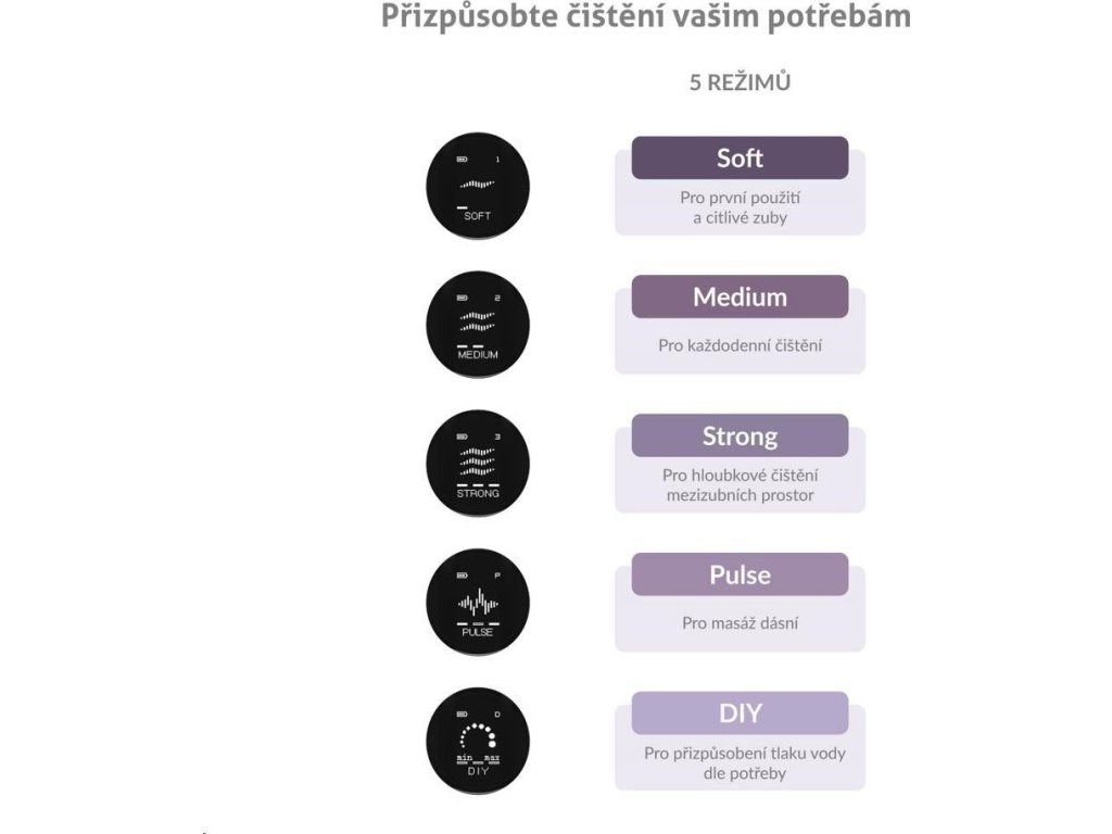 Vďaka funkcii DIY si môžete nastaviť intenzitu tlaku vody presne podľa vašich predstáv, a to v rozmedzí 8-110 PSI. Súčasťou sprchy je 6 špeciálnych trysiek (3× Standard, 1× Orthodontic, 1× Periodontal, 1× Dental Plaque), navrhnuté pre rôzne potreby: