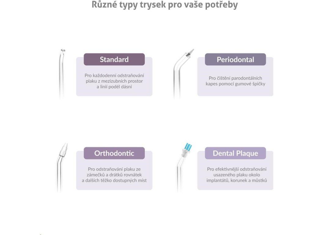 Súčasťou balenia je 6 rôznych druhov trysiek C-series, sprchu tak môže využívať celá rodina. Ďalšie trysky pre rôzne dentálne potreby je prípadne možné dokúpiť.