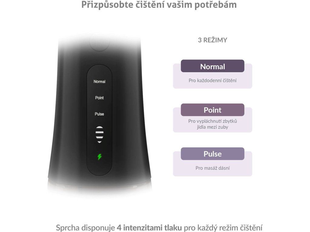 Sprcha ponúka 3 režimy čistenia s rôznymi intenzitami tlaku (30 – 130 PSI), vrátane režimu POINT, ktorý cielene a účinne odstráni zvyšky jedla z medzizubných priestorov.