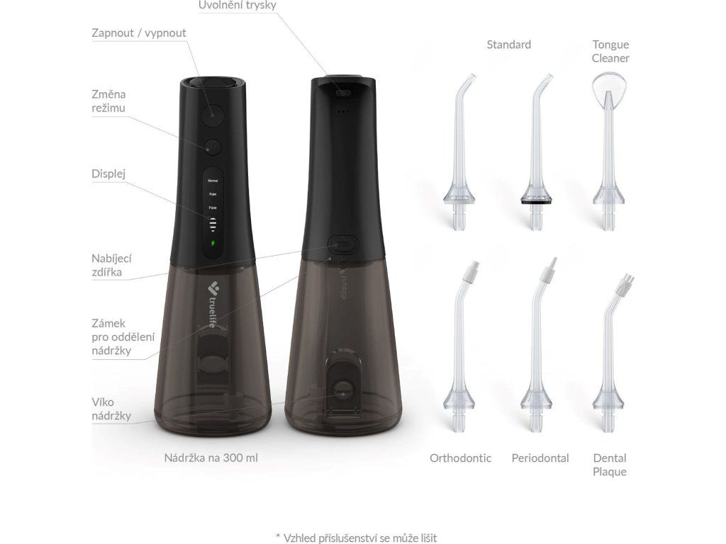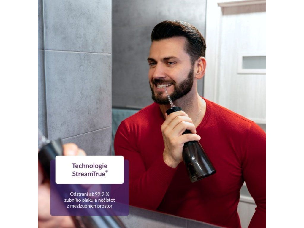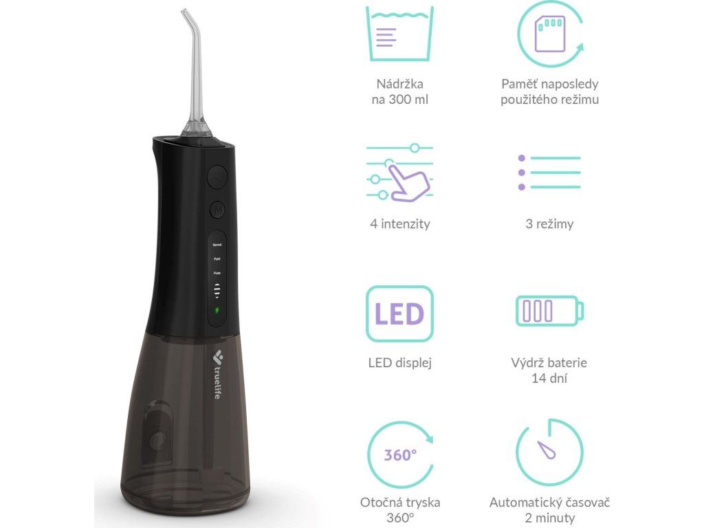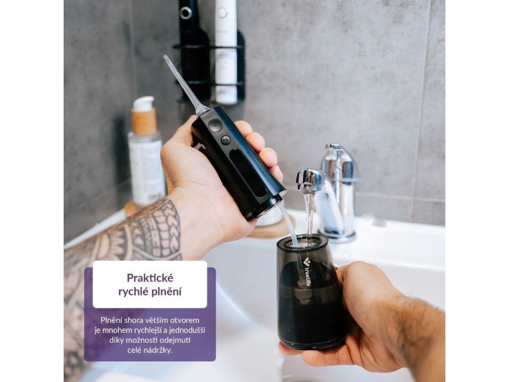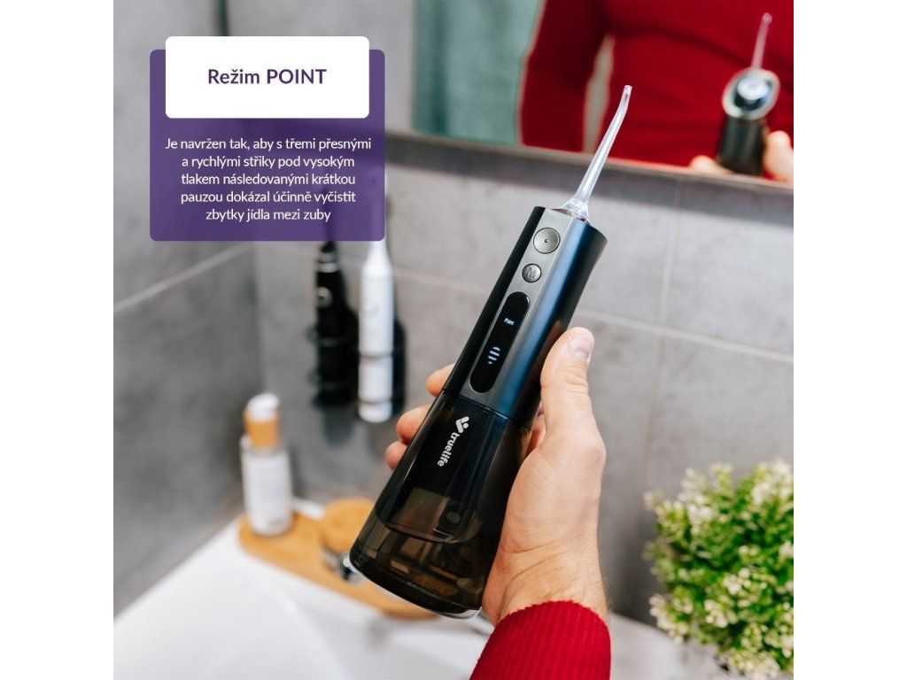 Medzizubné priestory bývajú rajom baktérií, ktoré sú príčinou zubných kazov. Najúčinnejšie sa ich zbavíme každodenným čistením nielen zubov, ale práve aj priestoru medzi nimi. Špeciálne kefky či zubné nite nemusia byť práve komfortné a ich neustále nakupovanie pociťuje naša peňaženka. Šetrnejšie riešenie vo všetkých smeroch predstavuje ústna sprcha TrueLife AquaFloss Compact L100 Black disponujúca 3 režimami čistenia, predovšetkým režimom POINT, ktorý cielene a účinne odstráni zvyšky jedla z medzizubných priestorov. 300ml nádržka s dvojitým plnením, zhora aj z boku, pohodlne vystačí na dvojminútové čistenie, ktoré stráži integrovaný časovač. Praktické je potom plnenie nádržky zhora väčším otvorom, ktoré je oveľa rýchlejšie a jednoduchšie ako plnenie menšou dierkou z boku, ktorou štandardné ústne sprchy disponujú. Vďaka tomu je celá príprava aj používanie ústnej sprchy rýchlejšia a komfortnejšia. Dokonalú starostlivosť zaistí 6 trysiek pre rôzne dentálne potreby, od klasického čistenia cez čistenie jazyka a odstránenie povlaku až po ortodontické či periodontálne potreby. Na použitie sprchy nie je potrebné pripojenie do siete, jej batéria vydrží pri použití 2× denne až 14 dní. Vďaka svojmu kompaktnému riešeniu s vami sprcha môže aj cestovať. Prehľadný displej zobrazuje aktuálne nastavenie, funkcia pamäť zaisťuje, že sa po zapnutí spustí naposledy použitý režim.