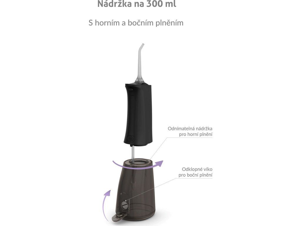 Nádržka s objemom 300 ml vystačí na vyčistenie celého chrupu a zároveň je dostatočne kompaktná. Okrem obyčajnej vody ju môžete naplniť ústnou vodou pre extra sviežosť.