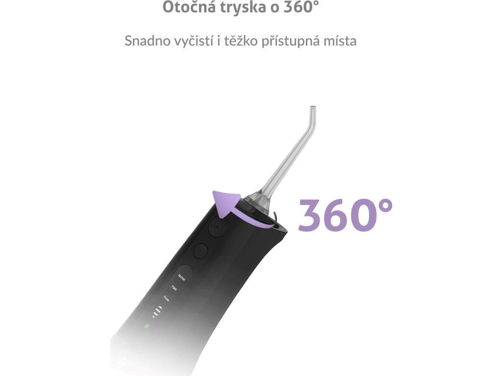 Hlavice trysky je otočná o 360 stupňů, takže snadno vyčistí všechna zákoutí vašich úst.