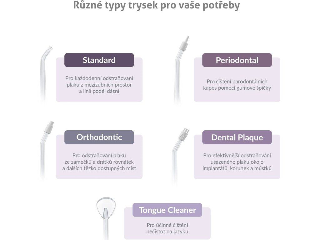 Súčasťou sprchy je 6 špeciálnych trysiek (2× Standard, 1× Orthodontic, 1× Periodontal, 1× Dental Plaque, 1× Tongue Cleaner), navrhnuté pre rôzne potreby: