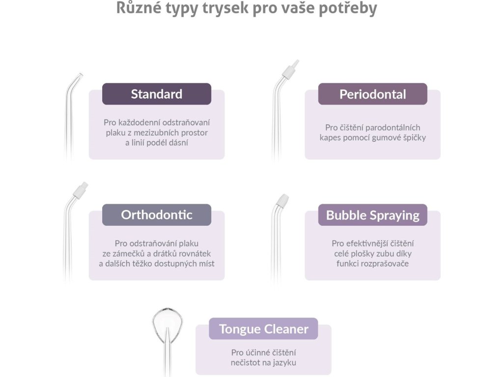 Súčasťou sprchy je 6 špeciálnych trysiek (2× Standard, 1× Orthodontic, 1× Periodontal, 1× Bubble Spraying, 1× Tongue Cleaner), navrhnuté pre rôzne potreby: