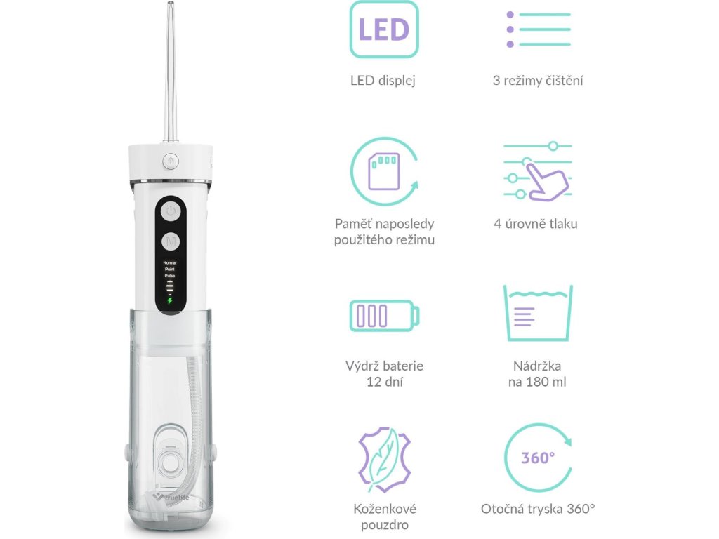 Doslova rajom pre baktérie sú v ústnej dutine medzizubné priestory. Chrániť zuby pred zubným kazom môžeme dôkladným čistením aj týchto ťažko dostupných miest. Ústna sprcha TrueLife AquaFloss Mini M50 je praktickým a komfortným pomocníkom. Poskytuje maximálne efektívne riešenie vďaka 3 režimom čistenia so 4 intenzitami tlaku pre každý z nich a technológiu StreamTrue®, ktorá odstráni až 99% povlaku a nečistôt. Technológia PulseTrue® príjemne masíruje ďasná a prispieva k ich regenerácii. Funkcia pamäť si zapamätá posledný použitý režim. Sprcha je novo vybavená aj jedinečnou tryskou Bubble Spraying technológiou, ktorá rozpráši vodu po celej ploche zuba. Nádržku s objemom 180 ml ľahko naplníte 3 rôznymi spôsobmi a hlavica otočná o 360° je zárukou, že sa dostanete do každého zákutia. Ústna sprcha je skvelá na doma, ale aj na cesty vďaka teleskopickému telu, koženkovému púzdru, možnosti uschovať trysku v hornej časti sprchy a výdrži batérie 12 dní.