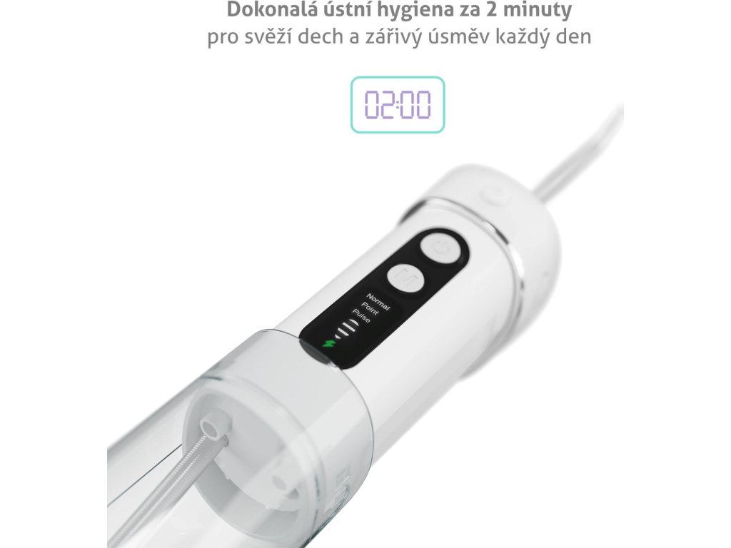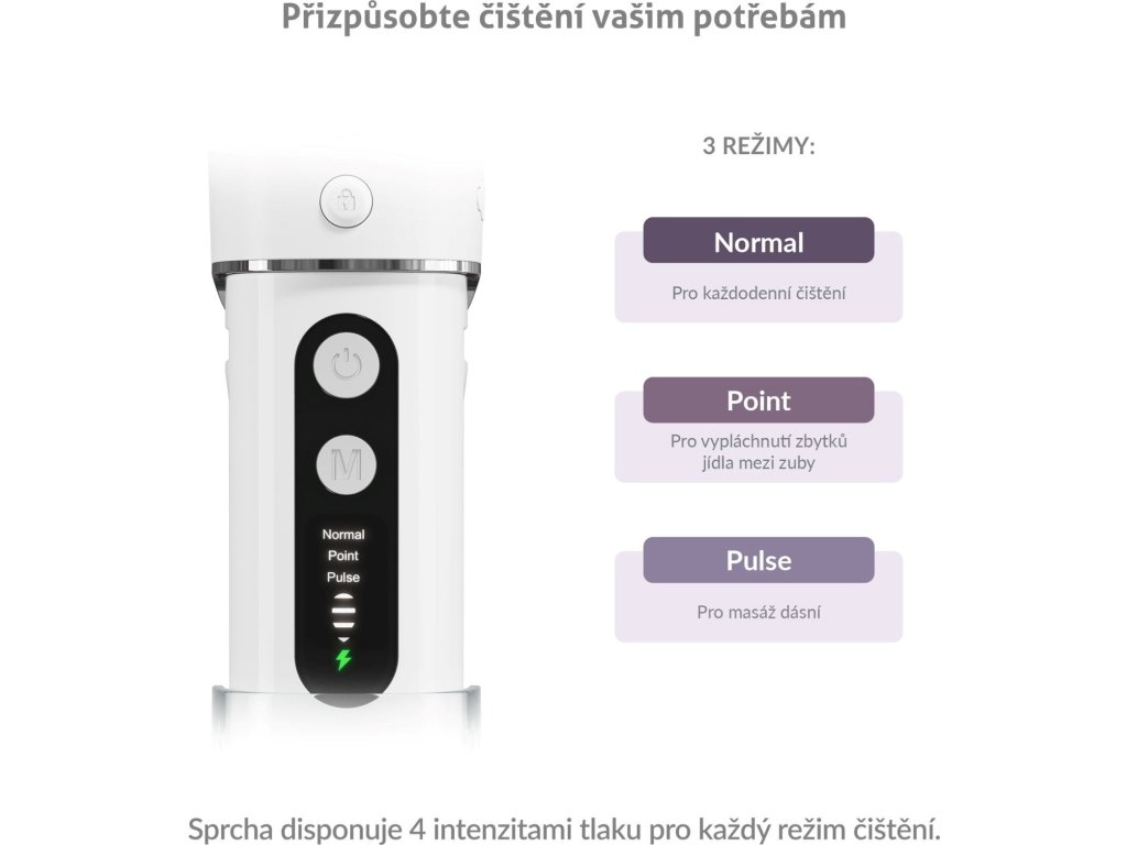 Sprcha poskytuje 3 režimy čistenia s rôznymi intenzitami tlaku (30 -130 PSI). Normal na bežné čistenie, Point na cielené a účinné odstránenie zvyškov jedla z medzizubných priestorov a Pulse na masáž ďasien.