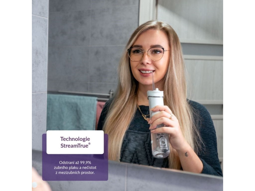 Ústna sprcha ponúka oveľa šetrnejšie a komfortnejšie riešenie na čistenie medzizubných priestorov a ťažko dostupných miest ako klasické medzizubné kefky a zubné nite. Zároveň je ekonomickejšie a ekologickejšie, pretože dané komponenty nie je nutné stále dokupovať a likvidovať. Pri ústnej sprche stačí naplniť 180 ml nádržku vodou a zvoliť jeden z 3 režimov čistenia (Normal, Point, Pulse) spolu s intenzitou tlaku, kde je pri každom režime možnosť voliť zo 4. Technológia StreamTrue®, ktorá pracuje na princípe mikrobubliniek vytvorených z vody a vzduchu, ktoré sú pod vysokým tlakom vháňané do medzizubných priestorov, sa potom postará o elimináciu až 99 % zubného povlaku a ďalších nečistôt. Veľkým pomocníkom je aj nová tryska Bubble Spraying technológiou rozprašovania vody po celej plôške zuba. Jej otočná hlavica umožňuje nastaviť rôznu šírku vodného lúča.