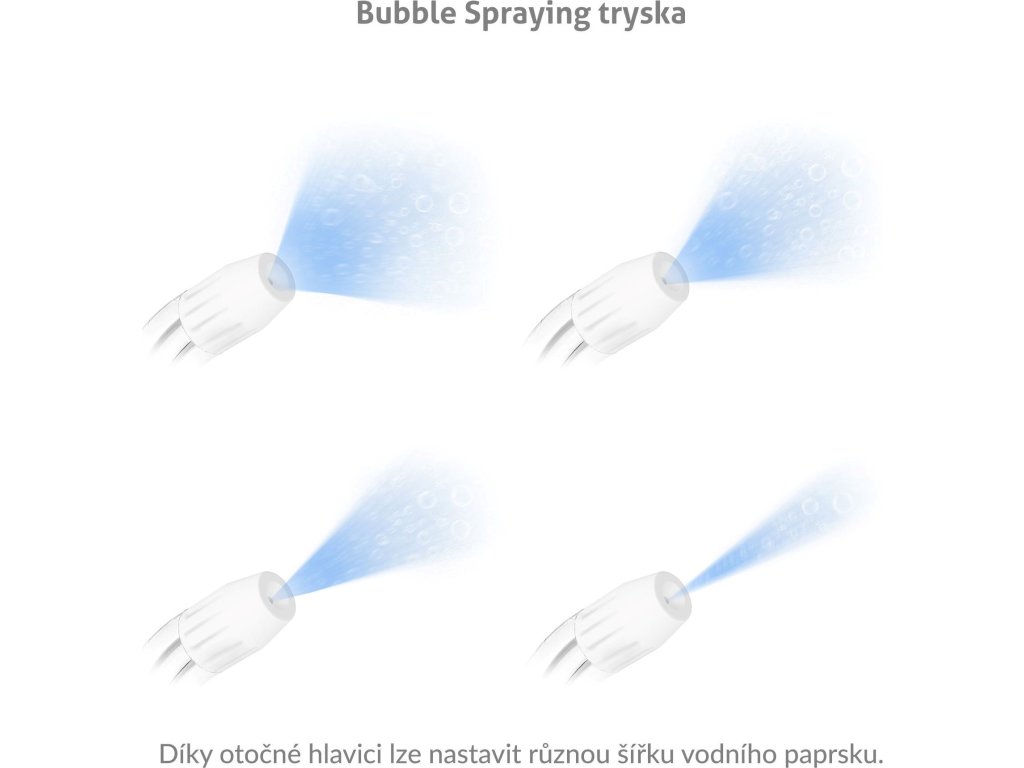 - Bubble Spraying – Slúži na vyčistenie celej plôšky zuba, vďaka funkcii rozprašovača. Vhodná aj pre osoby s citlivými ďasnami a porovnateľmi.