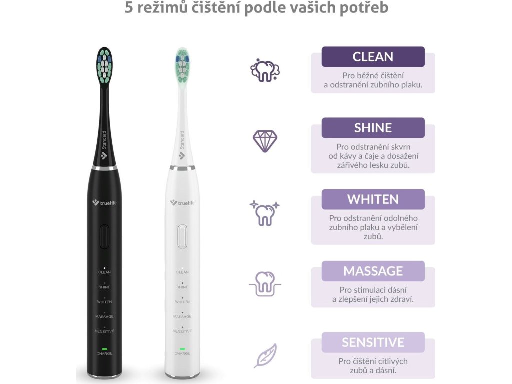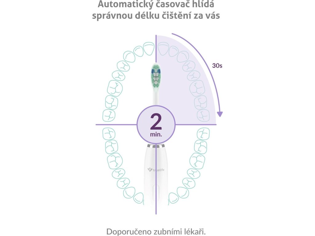 Sonické kefky TrueLife SonicBrush Clean30 obsiahnuté v sade disponujú 5 režimami čistenia, ktoré uľahčujú každodennú starostlivosť o zuby a ďasná. Bežné čistenie obstará režim Clean, s odolnejším zubným povlakom zatočí režim Whiten, ktorý zároveň prispieva k bieleniu zubov. Dokonale žiarivý úsmev zaistí režim Shine efektívne odstraňujúci pigmentové škvrny spôsobené napríklad kávou či čajom. Ak patríte k ľuďom s citlivejšími zubami a ďasnami, potom oceníte režim Sensitive. K zdravším ďasnám prispeje režim Massage, a to ich stimuláciou. Ideálna doba čistenia sú 2 minúty, strážiť ich ale nemusíte, časovač to obstará za vás. Tiež vždy po 30 sekundách upozorní, že je čas presunúť sa na ďalšiu časť chrupu.