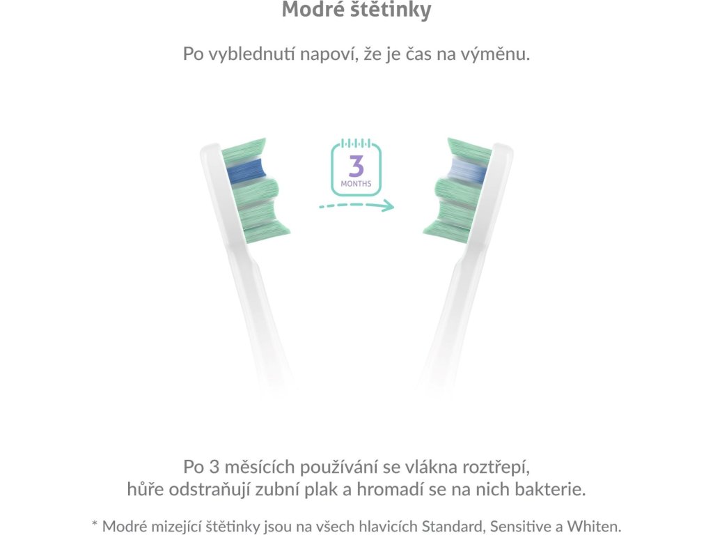 Zhruba po 3 mesiacoch je potrebné vymeniť hlavicu kefky, aby bola zaistená kvalita čistenia. Poznáte to podľa modrých štetiniek, ktoré postupne bielia.