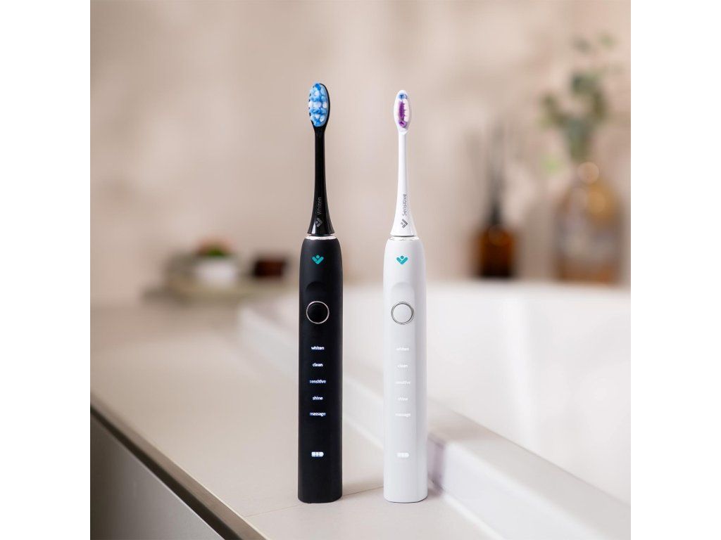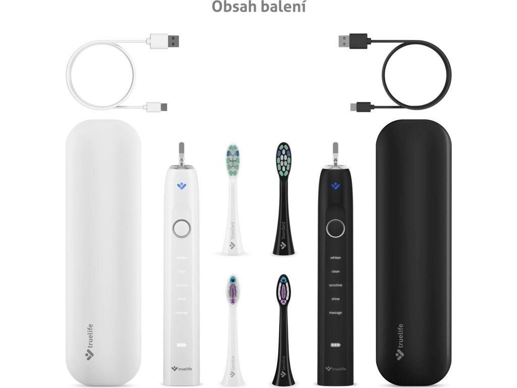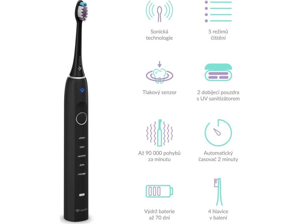 Zdravý úsmev je vizitkou nás všetkých. S balením dvoch sonických kefiek TrueLife SonicBrush Clean70 UV Duo bude starostlivosť o zuby a ďasná nielen dôkladná, ale navyše aj príjemná. Každá z kefiek čistí zuby rýchlosťou až 90 000 pohybov za minútu, čím odstráni až 12× viac zubného povlaku ako manuálna kefka. Sonická technológia SonicTrue jemnými vibráciami čistí plôšky zubov a vďaka víreniu vody s pastou vytvára mikrobublinky, ktoré preniknú aj do medzizubných priestorov. Tlakový senzor s technológiou SmartPressure stráži ideálny tlak a varuje pred nadmerným zaťažením ďasien či skloviny. Dobíjacie puzdro s UV sterilizáciou efektívne ničí až 99,9% baktérií a vírusov na hlaviciach. Kefky vydržia až 70 dní na jedno nabitie, disponujú 5 režimami čistenia a 2 typy hlavíc (Standard a Sensitive). Chytrý časovač stráži odporúčané 2 minúty čistenia a funkcia pamäte uchová posledný zvolený režim. Vďaka vysoko citlivému vibračnému senzoru sa kefka automaticky aktivuje a rozsvieti, akonáhle ju vezmete do ruky. Špeciálna jemne pogumovaná povrchová úprava rukoväte je príjemná na dotyk a zabraňuje kĺzaniu aj pri použití s vodou.