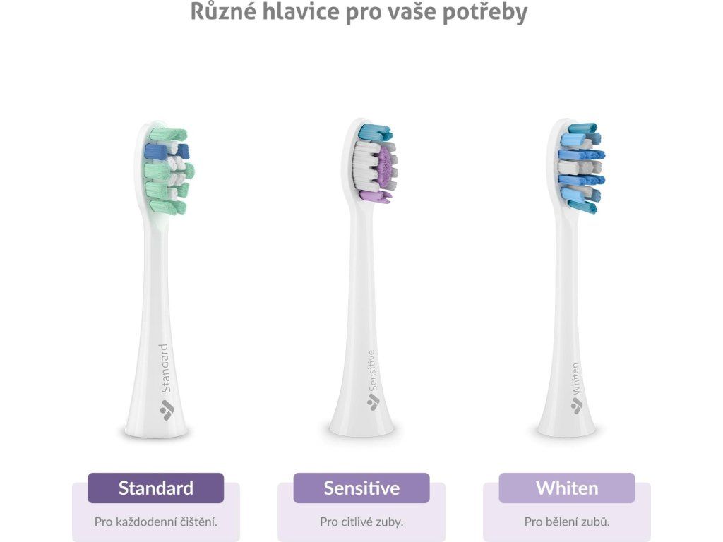 V balení nájdete pre každú kefku 2 náhradné hlavice, z čoho jednu využijete na každodenné čistenie (Standard), druhú na citlivé zuby (Sensitive). Na dokúpenie sú aj hlavice Whiten na bielenie zubov.