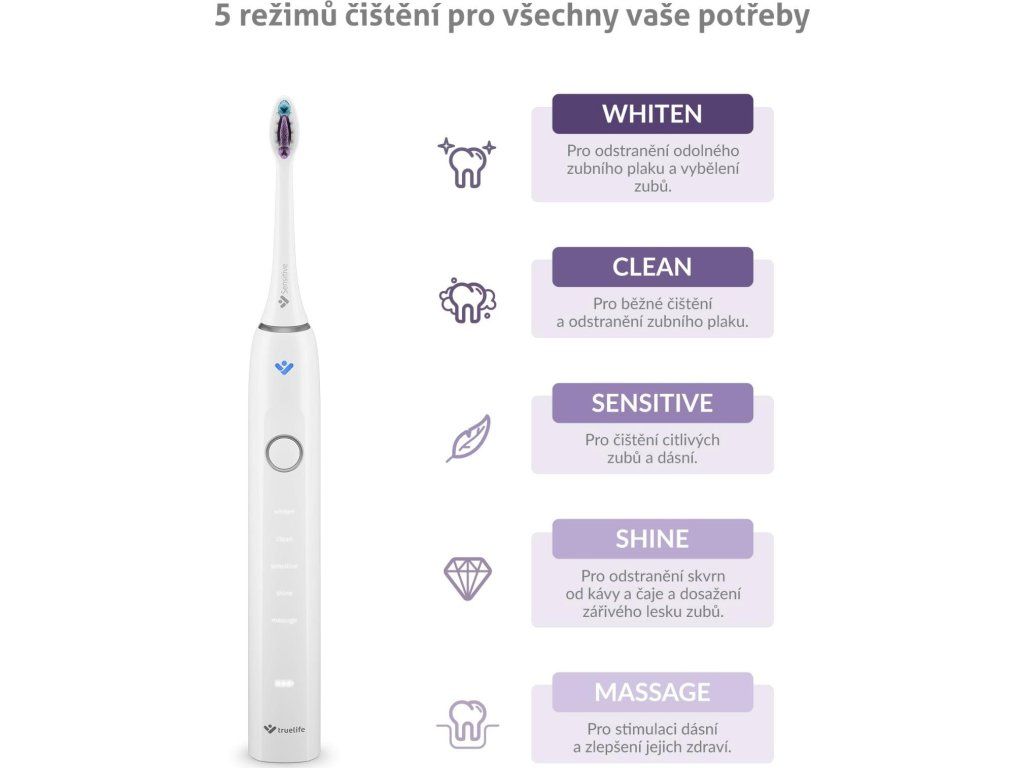 | Režimy | Whiten, Clean, Sensitive, Shine, Massage |