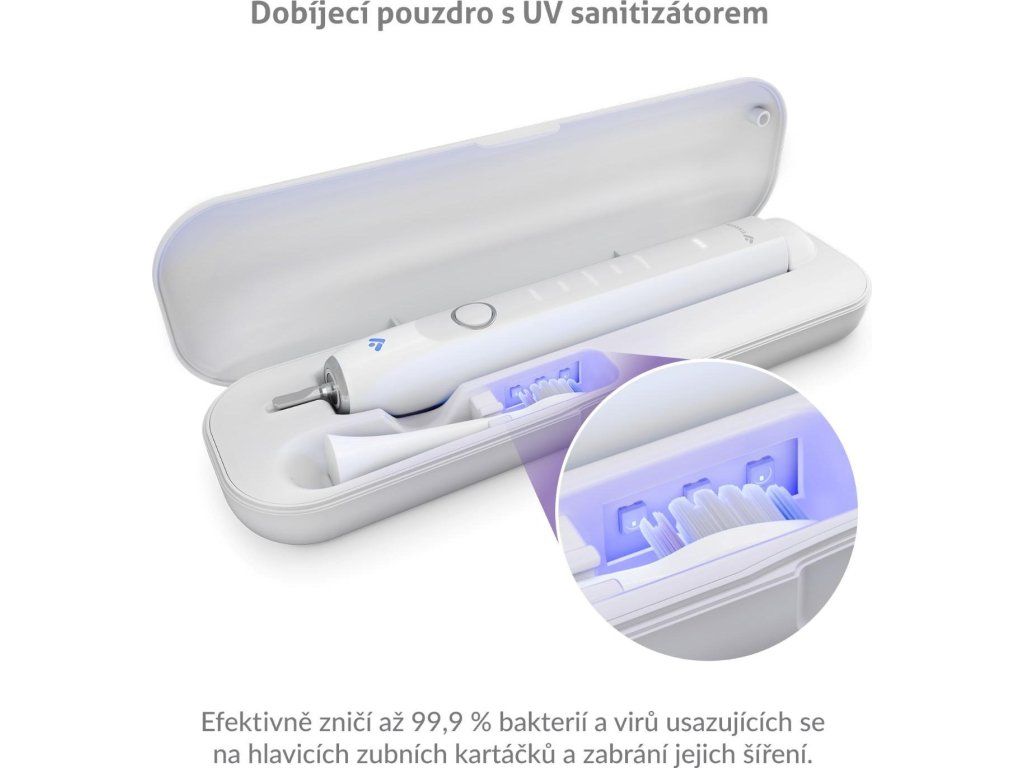 Stačí päť minút v dobíjacom púzdre a hlavice sú vďaka UV svetlu zbavené až 99,9% vírusov a baktérií. Puzdro vydrží na jedno nabitie až 17 dní pri použití 2× denne.