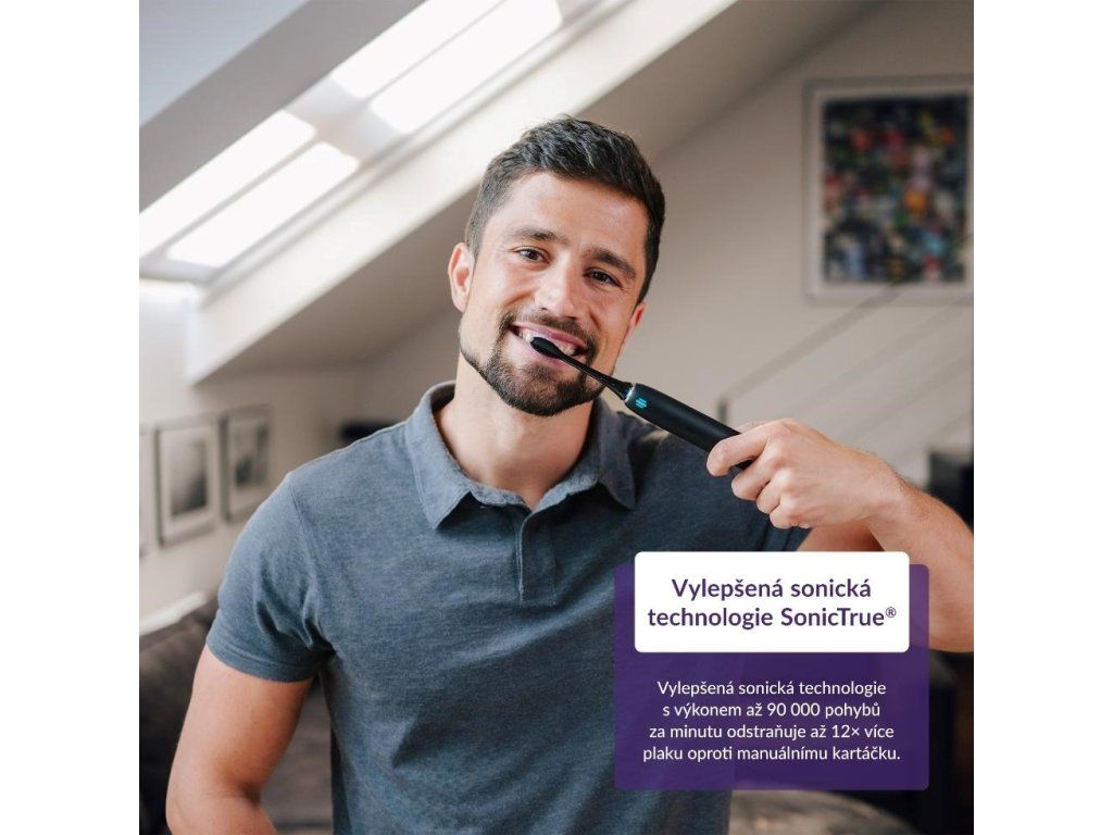 Technológia SmartPressure sleduje tlak, akým na zuby a ďasná pôsobíte, a farebne vás navedie k ideálnemu čisteniu. Modrá značí optimálny tlak, zelená maximum, a pri červenom svetle vás kefka prerušenými vibráciami upozorní, že je čas zvoľniť. Vďaka tomu, že je indikátor viditeľný ako spredu, tak aj zozadu kefky, máte v zrkadle vždy jasnú kontrolu nad svojou technikou čistenia a tým aj nad zdravím celej ústnej dutiny. Sonická technológia SonicTrue potom pomocou jemných vibrácií a mikrobubliniek čistí aj horšie prístupné miesta, a pritom zostáva šetrná k zubnej sklovine aj citlivým ďasnám.