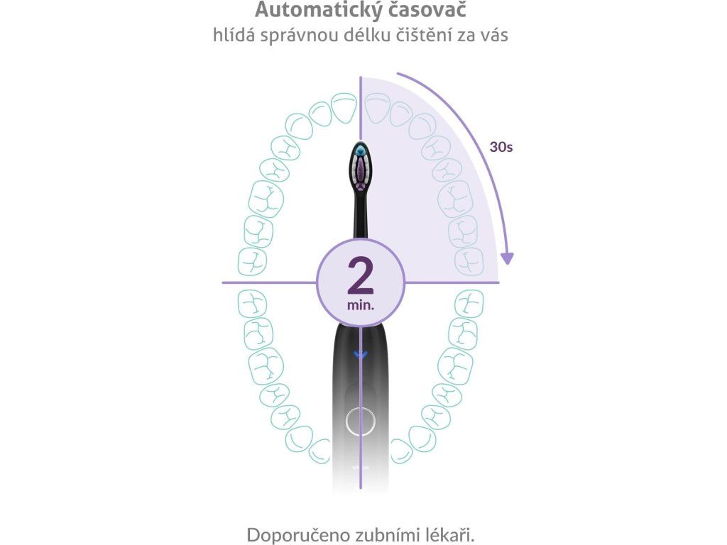 Spoľahlivý časovač za vás postráži ideálnu dĺžku čistenia. Po dobu 2 minút vás kefky vždy po 30 sekundách jemne upozornia, že je čas presunúť sa na ďalšiu časť ústnej dutiny.