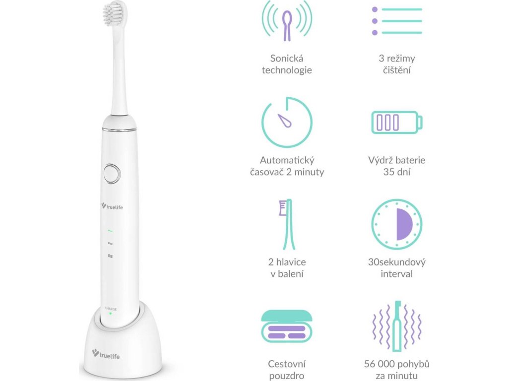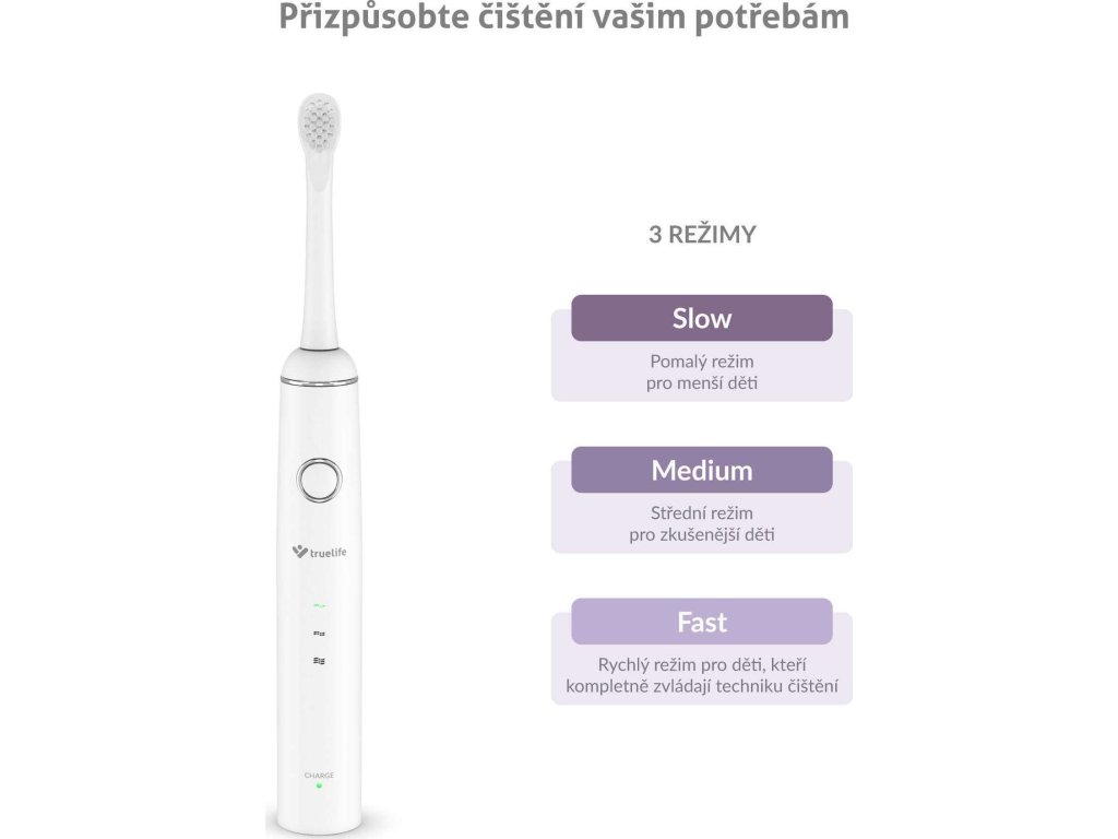 Sonická kefka TrueLife je svojou veľkosťou i jemnosťou štetín perfektne vhodná pre čistenie detských zubov. Kefka padne deťom skvele do ruky a čistenie je pre nich jednoduché. Ponúka 3 režimy čistenia – od pomalého pre menšie deti po rýchlejšie pre staršie deti, ktoré si zuby čistia kompletne samé a zvládajú techniku. O správnu dĺžku čistenia sa postará automatický časovač, takže už nemusíte strážiť za dverami.