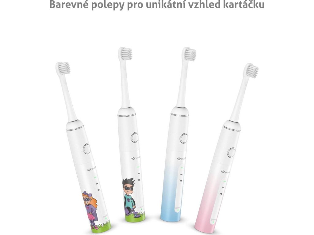 Súčasťou balenia sú 4 rôzne polepy, ktorými si kefku ozdobia chlapci aj dievčatá.