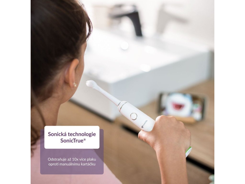 Sonická technológia SonicTrue® funguje na báze jemných vibrácií, pri ktorých štetiny kefky kmitajú vysokou rýchlosťou a efektívne odstraňujú až 99 % zubného povlaku. Štúdie dokazujú, že sonická kefka je ku detským zubom šetrnejšia, než manuálne čistenie alebo rotačné kefky. A navyše nevyžaduje toľko detského úsilia.