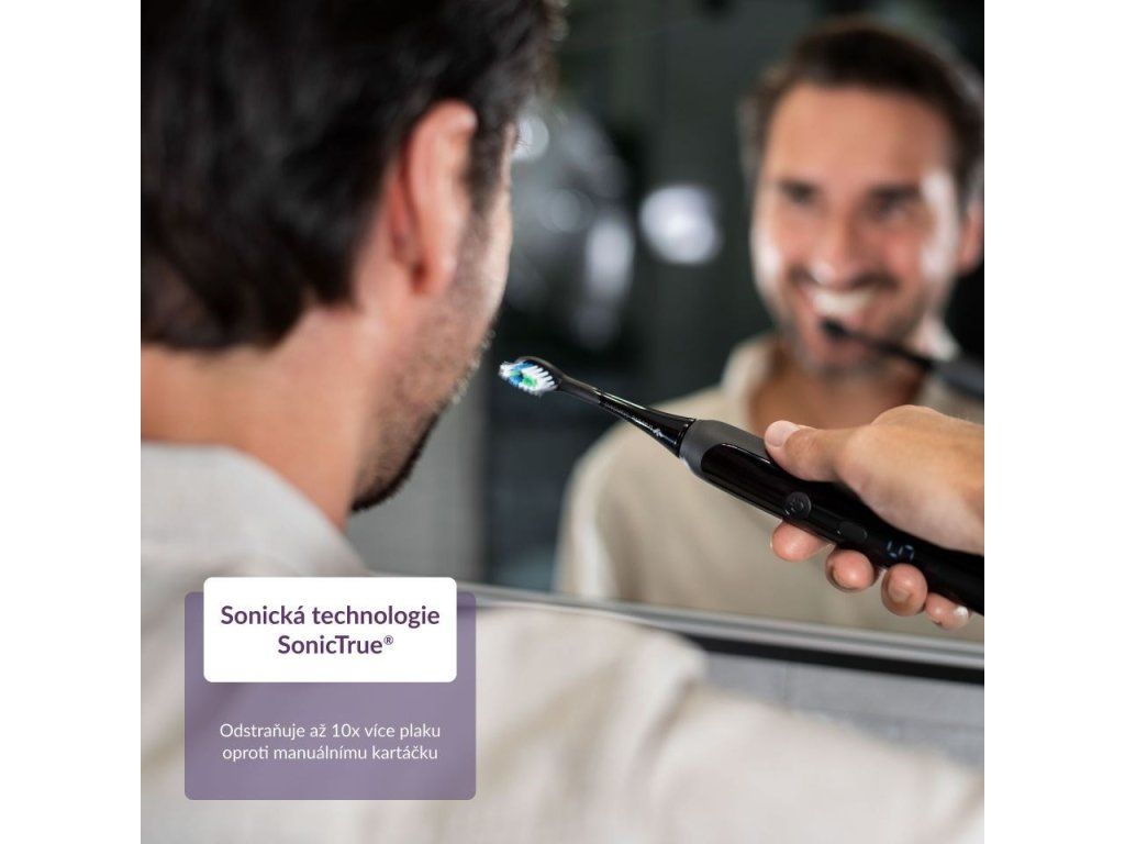 Sonická technológia SonicTrue® funguje na báze jemných vibrácií, pri ktorých štetiny kefky kmitajú vysokou rýchlosťou a efektívne odstraňujú zubný povlak. 80 000 pohybov za minútu vháňa vodu so zubnou pastou i do medzizubných priestorov a jemné vibrácie nedajú šancu povlaku, škvrnám ani baktériám. Sonická technológia je navyše šetrnejšia ku zubnej sklovine, než manuálne čistenie alebo rotačné kefky.