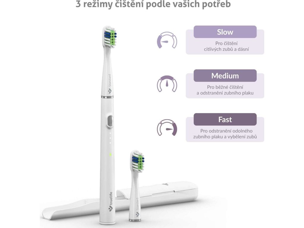 Sonická kefka TrueLife SonicBrush Slim20 ukrýva vo svojom štíhlom tele veľký výkon. 3 režimy čistenia si vďaka kompaktnému slim designu a nízkej hmotnosti môžete užívať aj kdekoľvek na cestách. Čistiace režimy sa líšia intenzitou, ktorou kmitajú štetiny hlavice. Pomalý SLOW režim sa hodí aj na čistenie citlivých zubov a ďasien, režim MEDIUM je ideálny na bežné každodenné čistenie a maximálne efektívne odstraňuje zubný povlak, najrýchlejší FAST režim potom odstráni aj naozaj odolný zubný povlak a zuby vybieli. Posledne použitý režim sa uchová v pamäti a časovač postráži ideálnu dobu čistenia 2 minúty, pričom vždy po 30 sekundách upozorní krátkou pauzou, že je čas posunúť sa do ďalšej časti úst.