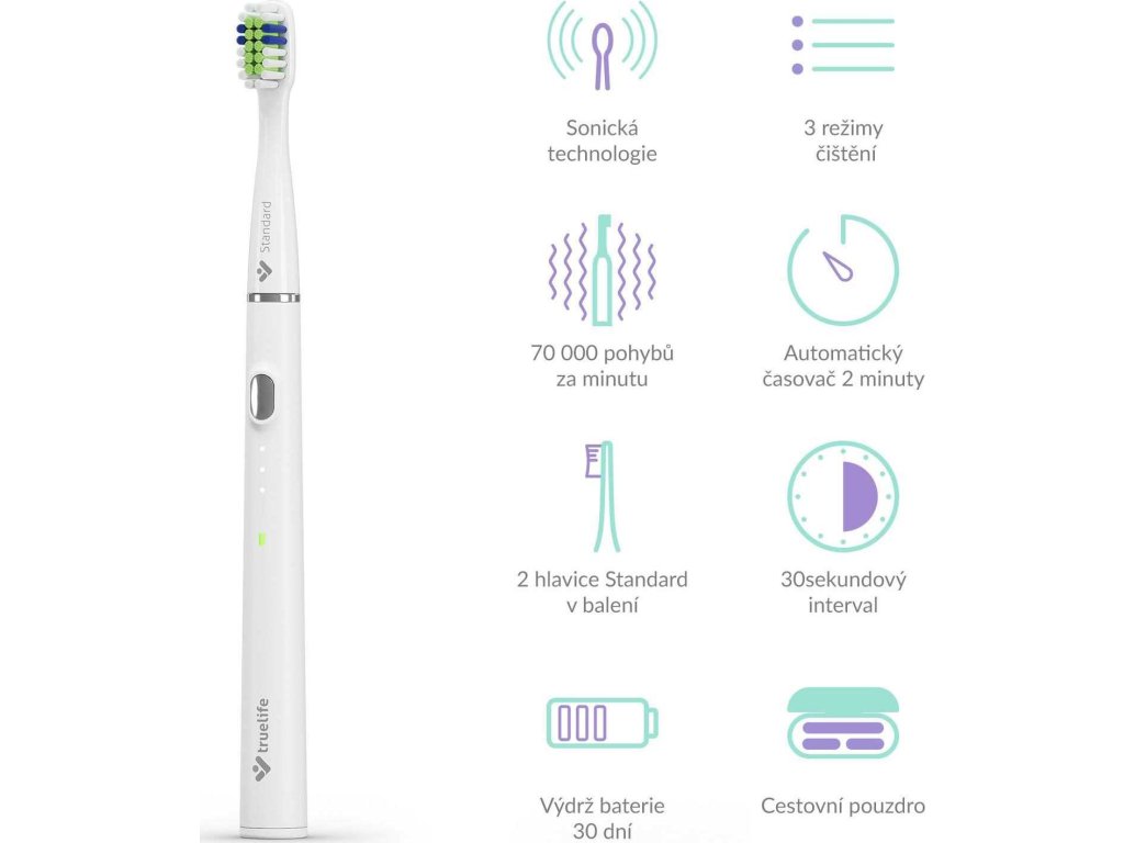 TrueLife SonicBrush Slim20 disponuje sonickou technológiou SonicTrue®, ktorá efektívne a zároveň šetrne pomocou jemných vibrácií bojuje proti zubnému povlaku. Hlava kefky kmitá rýchlosťou až 70 000 pohybov za minútu a vírením vody so zubnou pastou dochádza k čisteniu aj medzizubných a horšie dostupných priestorov. Balenie obsahuje hneď 2 čistiace hlavice, z ktorých každá vydrží až 3 mesiace používania. Moment na jej výmenu indikujú špeciálne modré štetiny, ktoré postupne blednú. Máte tak istotu, že sa nezníži účinnosť čistenia.
