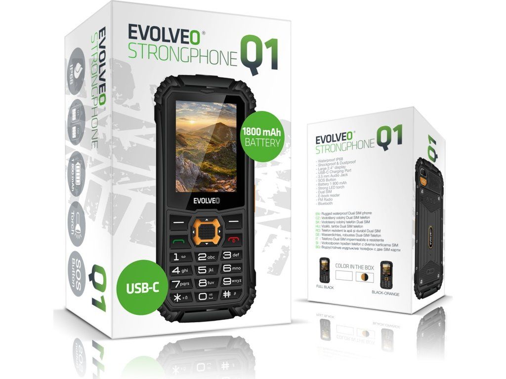 Hneď na prvý pohľad upúta EVOLVEO StrongPhone Q1 vašú pozornosť spojením neústupnej odolnosti s prekvapivo nízkou hmotnosťou (len 139 gramov vrátane batérie). V súboji s živlami tento tlačidlový mobil obstojí vďaka odolnosti voči vode a prachu stupňa IP68. Môžete s ním behať v daždi, brodiť sa bahnom alebo pracovať v dielni či na stavbe, kde poletuje prach alebo piliny. K tomu všetkému sa navyše pridáva zvýšená odolnosť voči nárazu, takže sa nemusíte báť ani náhodných nehôd, ktoré sa môžu na ferratách alebo pri stavebných prácach stať okamžite.