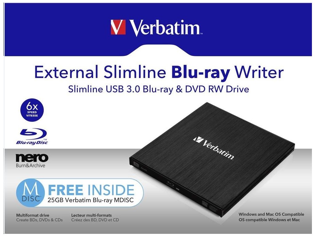 VERBATIM Slimline Blu-ray Rewriter USB 3.0 Bezplatný BR disk 25 GB (CD DVD BD Mdisc)