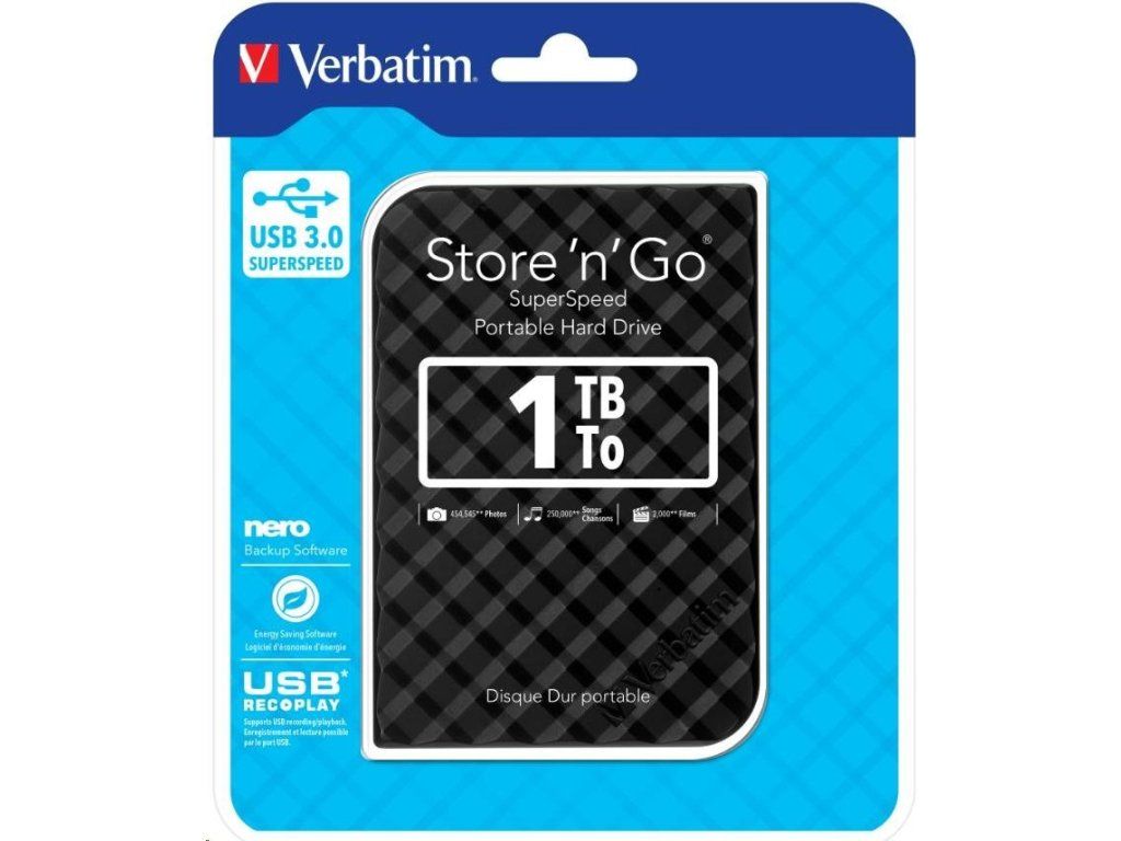 VERBATIM HDD 2.5" 1TB prenosný pevný disk Store 'n' Go USB 3.0, čierna Špeciálne funkcie: Dostupné farby: čierna, strieborná, biela, červená a modrá Dostupné kapacity: 500 GB, 1 TB a 2 TB Vysokorýchlostné úložisko s vysokou kapacitou. Rýchle a bezpečné riešenie na rozšírenie úložiska alebo zálohovanie súborov USB 3.0 SuperSpeed - pre veľmi rýchly prenos dát Nero Backup Software Softvér na úsporu energie USB REC & PLAY* - podporuje nahrávanie/prehrávanie cez USB 2 roky obmedzená záruka** Systémové požiadavky: PC alebo Mac s USB 3.0 Windows XP / Vista / Windows 7 a 8 Mac OS X 10.4 alebo vyššia Obsah balenia: Prenosný pevný disk / USB 3.0 Kábel / Nero Backup Software / Green Button Energy Saving Software / Verbatim Formatter / Quick Start Guide / User Guide (predinštalovaný na disku).