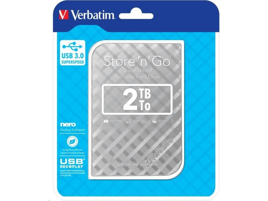 VERBATIM HDD 2.5" 2TB prenosný pevný disk Store 'n' Go USB 3.0, strieborná Špeciálne funkcie: Dostupné farby: čierna, strieborná, biela, červená a modrá Dostupné kapacity: 500 GB, 1 TB a 2 TB Vysokorýchlostné úložisko s vysokou kapacitou. Rýchle a bezpečné riešenie na rozšírenie úložiska alebo zálohovanie súborov USB 3.0 SuperSpeed - pre veľmi rýchly prenos dát Nero Backup Software Softvér na úsporu energie USB REC & PLAY* - podporuje nahrávanie/prehrávanie cez USB 2 roky obmedzená záruka** Systémové požiadavky: PC alebo Mac s USB 3.0 Windows XP / Vista / Windows 7 a 8 Mac OS X 10.4 alebo vyššia Obsah balenia: Prenosný pevný disk / USB 3.0 Kábel / Nero Backup Software / Green Button Energy Saving Software / Verbatim Formatter / Quick Start Guide / User Guide (predinštalovaný na disku).