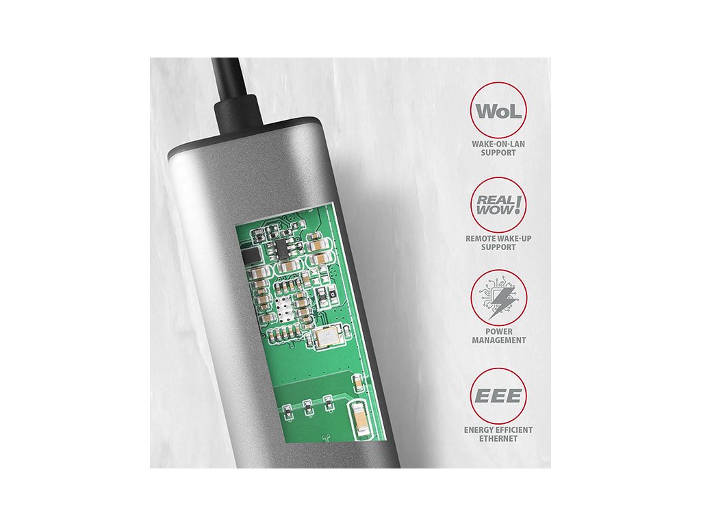 Adaptér podporuje pokročilú správu napájania, ktorá znižuje straty energie počas nečinnosti alebo slabej sieťovej prevádzky. Podporuje aj pokročilú úsporu energie pri odpojení ethernetového kábla.