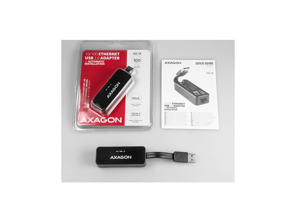 Kompaktný adaptér AXAGON ADE-XR ľahko premení USB 2.0 port na Fast Ethernet 10/100Mbit port.