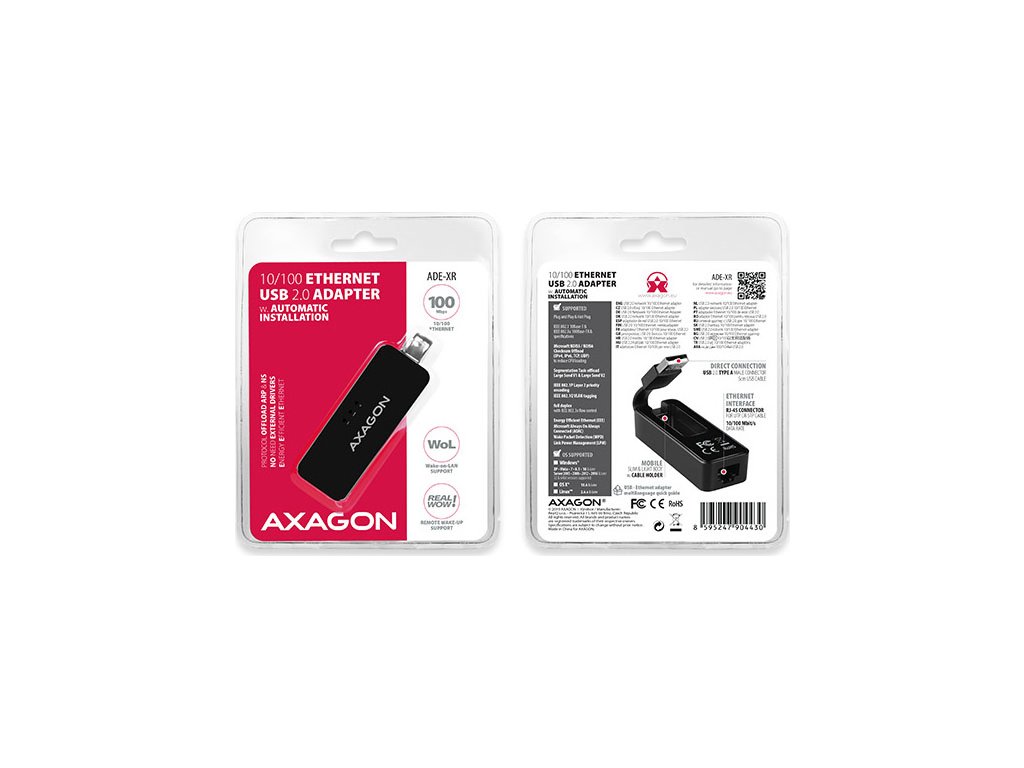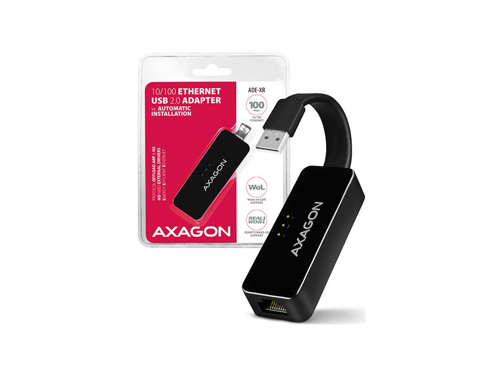AXAGON ADE-XR, USB 2.0 - Fast Ethernet sieťová karta, auto inštal, čierna