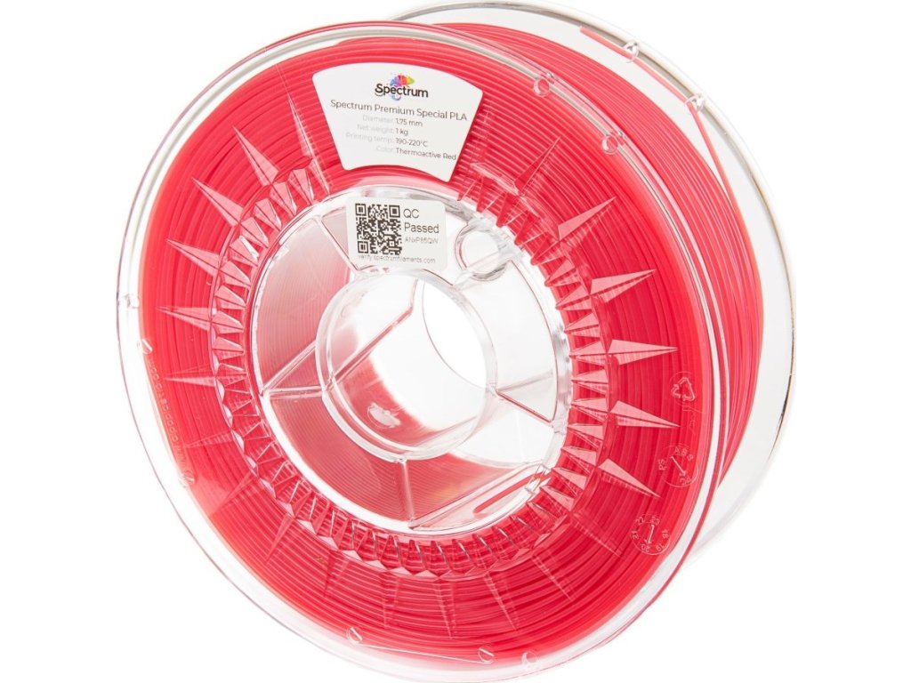 Spectrum PLA Thermoactive je vlákno na báze čistého PLA zmiešaného s termochromným pigmentom. Vďaka tomuto mimoriadne originálnemu doplnku aditívne výrobky menia svoju farbu podľa teploty. Farba sa zmení z červenej na krémovú, akonáhle povrchová teplota predmetu prekročí 30°C. Predchádzajúca farba sa obnoví postupne, akonáhle položka dosiahne svoju počiatočnú teplotu.