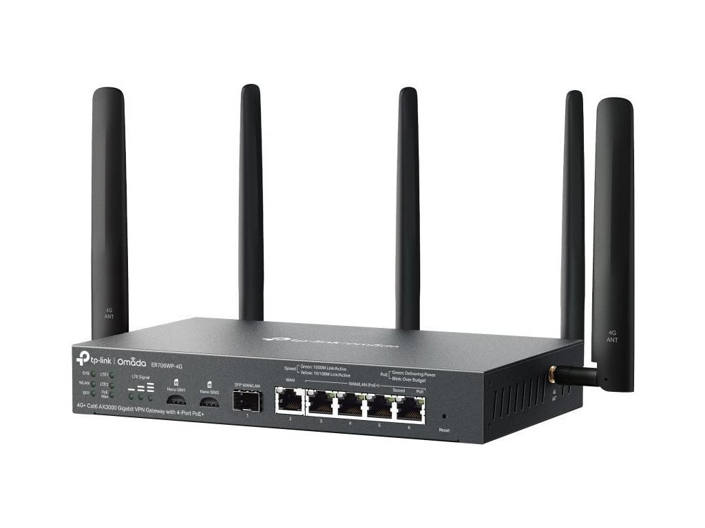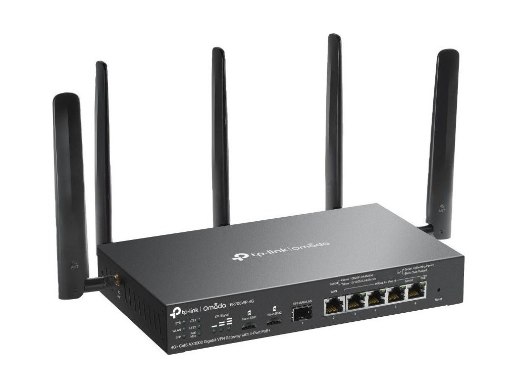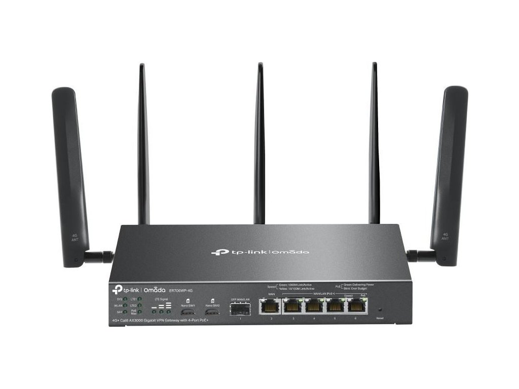 TP-Link ER706WP-4G OMADA VPN 4G+Cat6 router (AX3000,1xSFP WAN/LAN,1xGbEWAN,4xGbELAN/WAN,4xPoE+,45W,2xnanoSIM)