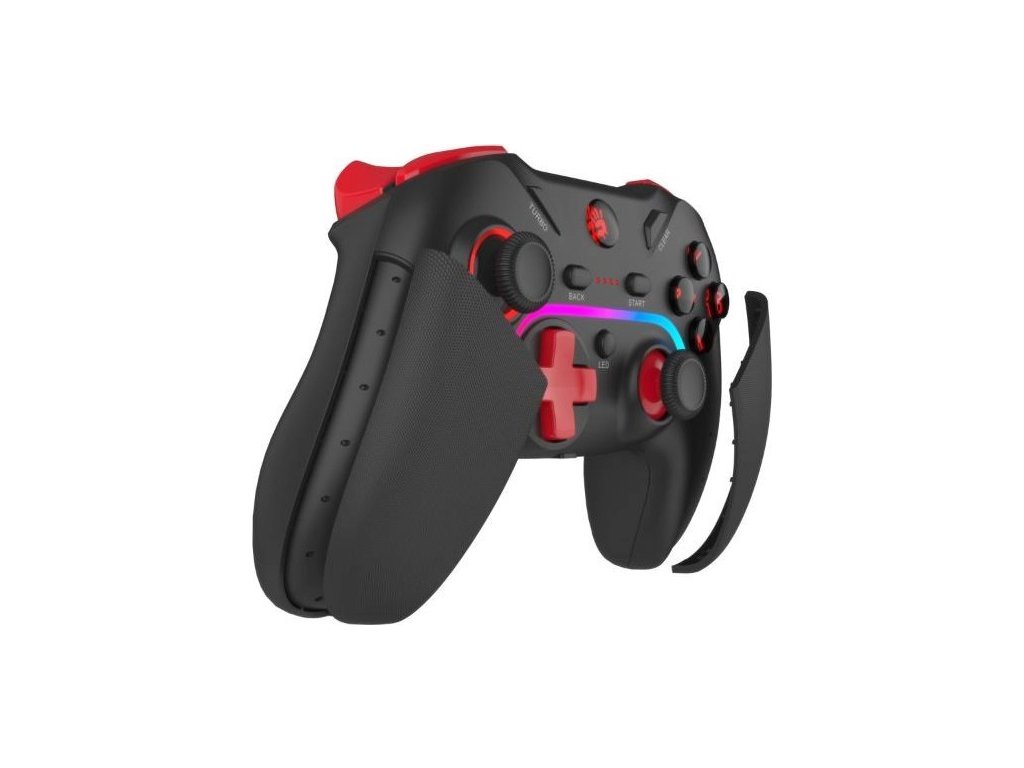 - Ovládač disponuje 18-timi tlačidlami (Tlačidlá: Domov (HOME), Späť (Back), Štart, Turbo, Clear, 4x LED indikátory, 2x 3D 360 joysticky, Šípky (D-pad), A, B, X, Y, RB, LB, RT, LT, LED (na vypínanie a zapínanie LED podsvietenia, ľavé a pravé macro tlačidlo)