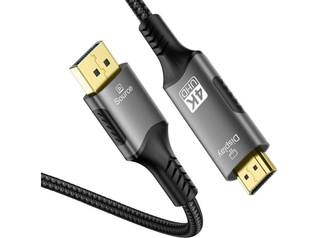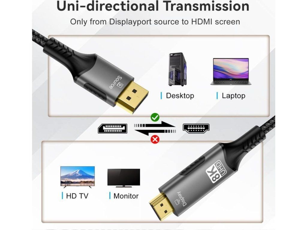 Kábel DisplayPort - HDMI funguje jednosmerne, kábel obsahuje elektronický prevodník DP -> HDMI, ktorý dokáže konvertovať signál iba v smere DP -> HDMI.
