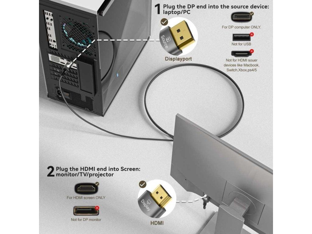 - Kábel umožňuje pripojiť HDMI monitor, TV a iný zobrazovač s konektorom HDMI k počítaču alebo notebooku s výstupom DP (Displayport)