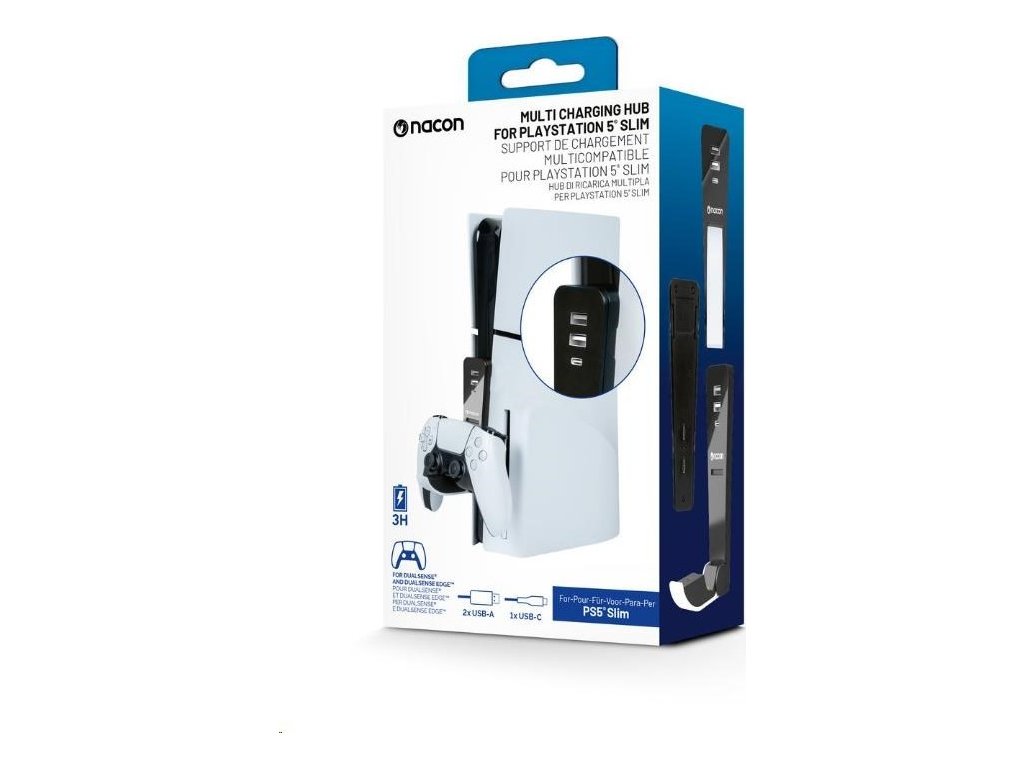 Nabíjajte svoj bezdrôtový herný ovládač DualSense alebo DualSense Edge s pomocou tohto nabíjacieho doku od spoločnosti Nacon. Dok sa pripája k USB-C portom na prednej strane konzoly PlayStation 5 Slim a dokáže plne nabiť ovládač počas troch hodín. Potom, čo si nabitý ovládač vezmete z doku späť, môžete dok priložiť ku konzole, aby ste naň nevedomky nezavadili. Dok navyše ponúka dva porty USB-A a jeden port USB-C, ku ktorým môžete v prípade potreby pripojiť ďalšie zariadenia.