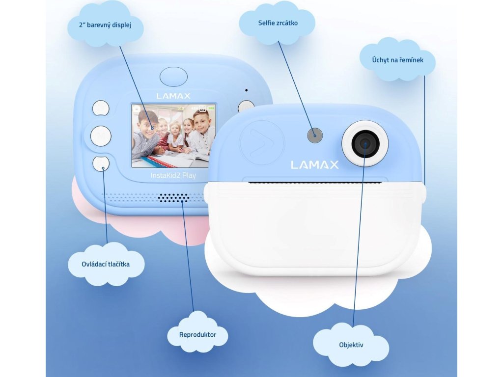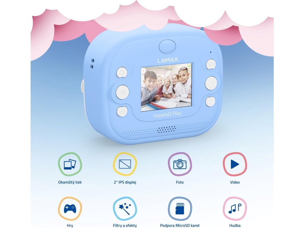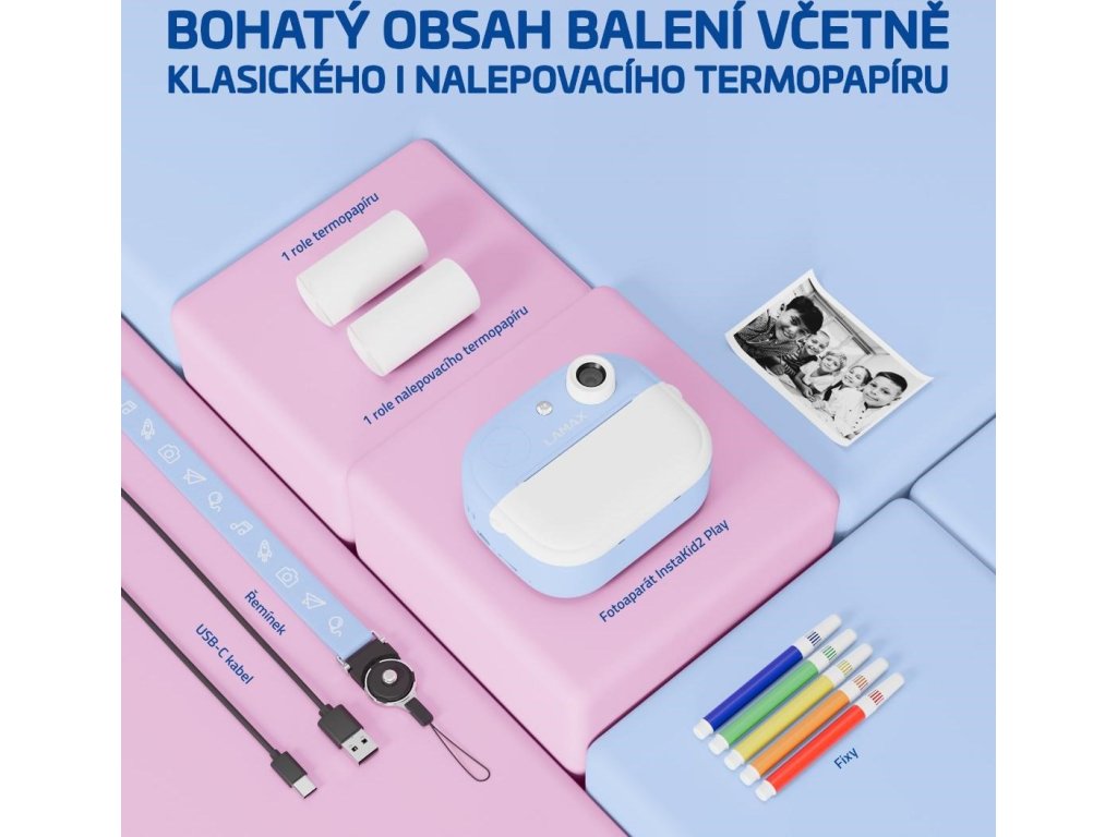 LAMAX InstaKid2 Play je foťák, ktorý nestráca čas. Deti si s ním jednoducho zaznamenajú každý dôležitý moment a počas sekundy ho majú v ruke. Čiernobiele snímky sa môžu premeniť na farebné spomienky pomocou fixiek, ktoré sú súčasťou balenia – stačí ich len vyfarbiť, pridať do vlastného albumu alebo nimi potešiť napríklad babičku. Vďaka jednoduchému ovládaniu, dvom ruličkám v balení (vrátane samolepiacej), originálnemu dizajnu a výkonnej kamere so 48 Mpx a FullHD videom, sa foťák stane nepostrádateľným spoločníkom na výlety, oslavy aj tvorivá popoludní s kamarátmi. Obľúbia si ho aj staršie deti, ktoré si môžu svoje snímky aj videá ukladať na microSD kartu a uchovať si tak svoje prvé filmárske pokusy. Na výber je ružová alebo modrá varianta a nechýba ani praktická šnúrka na krk, aby mali deti foťák stále po ruke. A keď práve nefotí? Zábavu zaistí päť hier priamo vo fotoaparáte. Tento foťáčik totiž nie je len o spomienkach, je tiež o radosti, sebavyjadrení a fantázii.