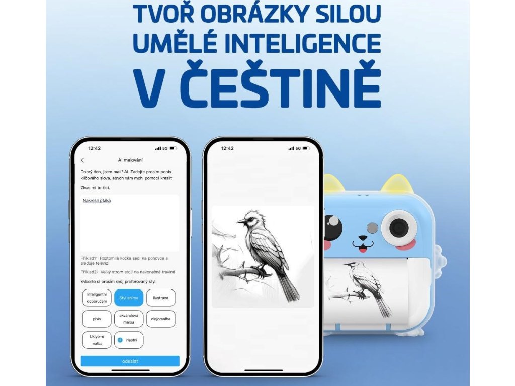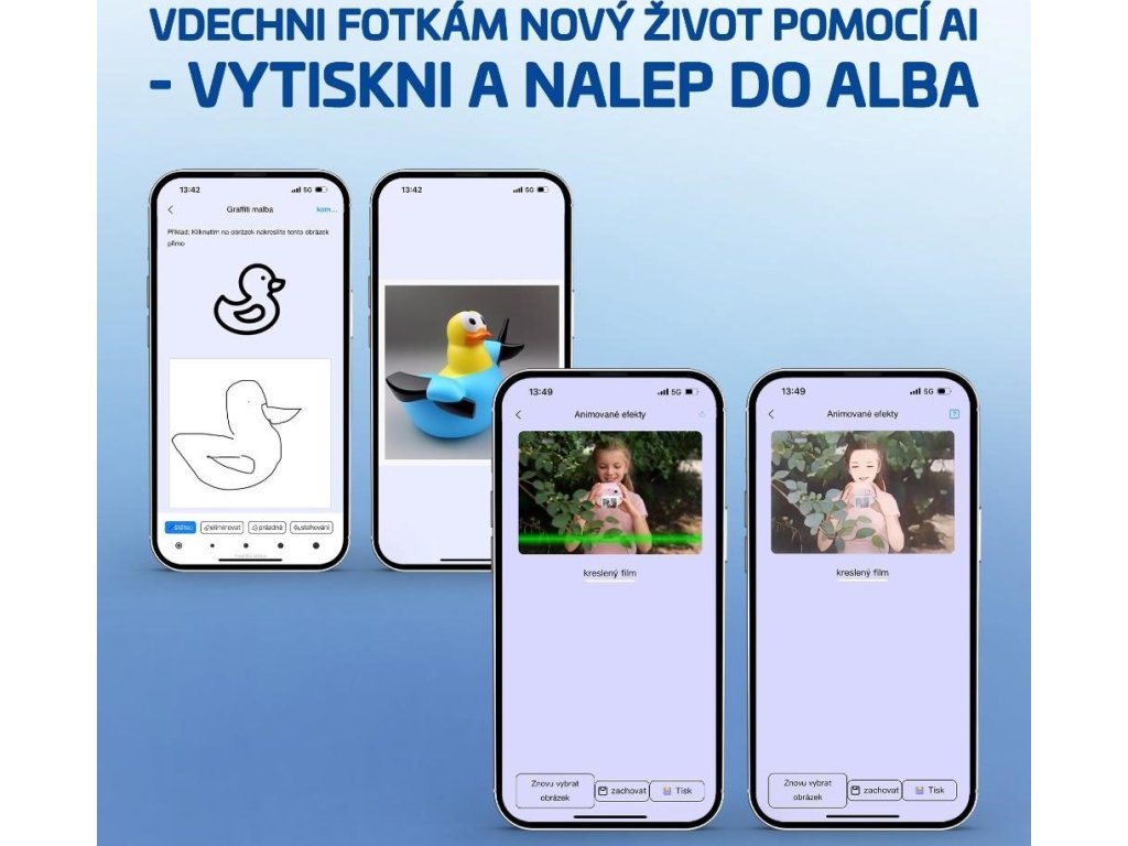 Foťák je prepojený s chytrou aplikáciou v češtine, takže jej ovládanie zvládnu aj menšie deti. Aplikácia toho ale vie oveľa viac. Okrem tlače fotiek, poznámok alebo samolepiek priamo z telefónu zvláda aj skenovanie ručne písaných zápiskov, preklady textov z obrázkov, AI vyfarbovanie, tvorbu obrázkov pomocou umelej inteligencie alebo prevod fotografií do animovaného štýlu. Stačí pár kliknutí a deti si samy vytvoria obrázky presne podľa svojej predstavy.