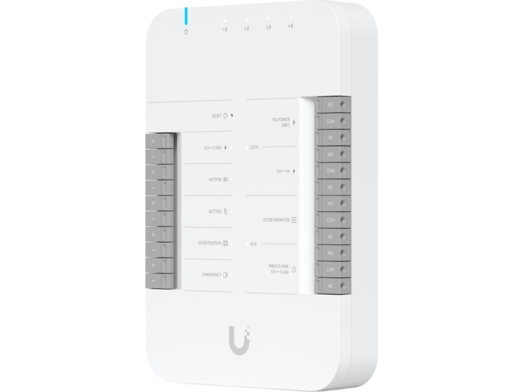 Rozhraní: 5× GbE RJ-45, 2× výstup pro zámek, 2× AUX výstup, 4× digitální vstup (pro senzory a tlačítka), 1× výstup DC 12 V/ 0,33A